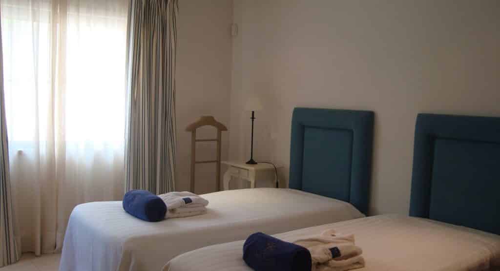 Os apartamentos possuem uma sala comum, dois quartos, um com cama de casal em suite, outro quarto com 2 camas de solteiro, e casa de banho, hall de entrada e terraço externo.