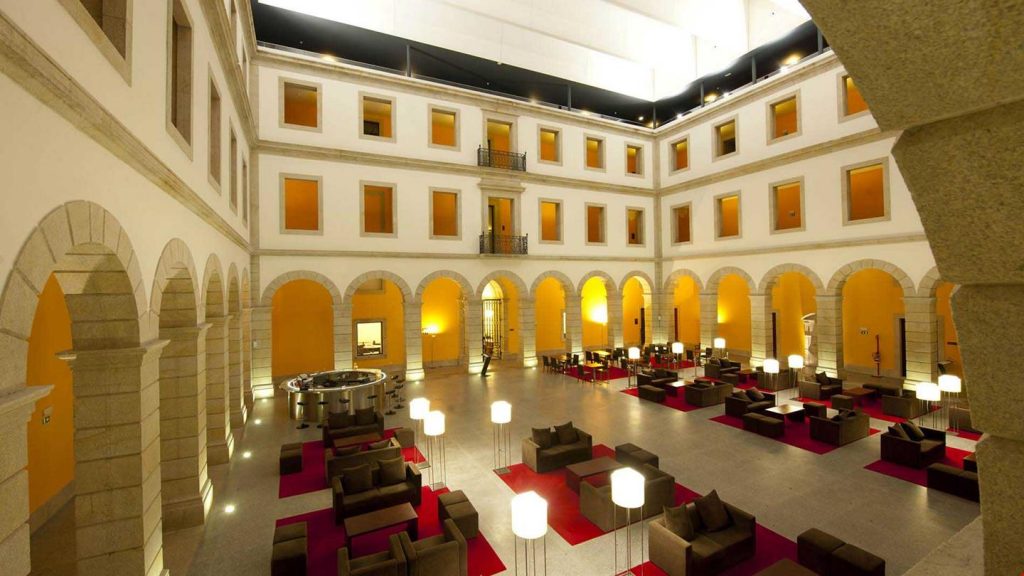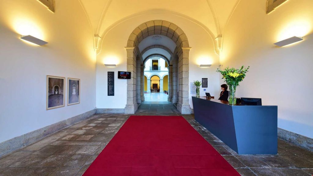 O lobby desta Pousada com o seu amplo claustro forma nos diferentes recantos ambientes de luz e onde o céu permanece visível através de uma cobertura em vidro
