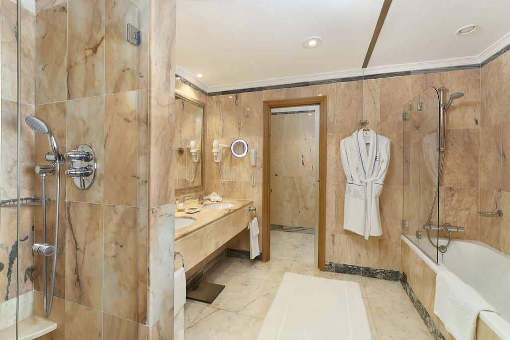 As casas de banho estão equipadas com aquecedores de toalhas, secador de cabelo, com luz incorporada e outras facilidades. Os hóspedes têm ao seu dispor um roupão e chinelos.